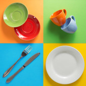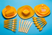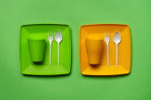 dwie łyżki i dwie płyty żółto-zielone na papierowym żółto-zielonym tle z ukośną linią demarkacyjną, koncepcją dań i żywności
