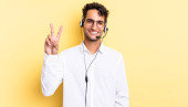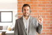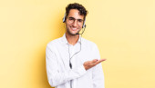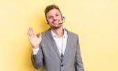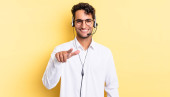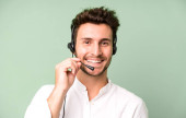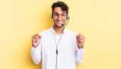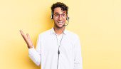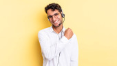 młody dorosły Hiszpan wygląda na szczęśliwego i przyjemnie zaskoczonego. koncepcja telemarketingu