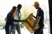 Zdjęcie "kaukaski dostawca człowiek w żółtym mundurze czapka dostarczając papierową eko torbę z jedzeniem spożywczym na wynos mea" może być wykorzystywane do celów osobistych i komercyjnych zgodnie z warunkami zakupionej licencji Royalty-free. Obraz jest dostępny do pobrania w jakości wysokiej rozdzielczości do 5760x3840.