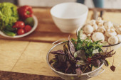 Kawałek bazylii w dłoni i zielenina w zlewie kuchennym.