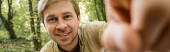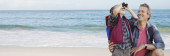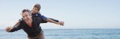 Uśmiechnięty rodzic trzymający dziecko na plaży w pobliżu Adriatyku we Włoszech, sztandar