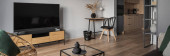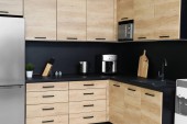 Zdjęcie "Nowoczesna kuchnia z drewnianymi meblami i czarnym zlewozmywakiem, płytą grzejną i piekarnikiem indukcyjnym w szarej ścianie" może być wykorzystywane do celów osobistych i komercyjnych zgodnie z warunkami zakupionej licencji Royalty-free. Obraz jest dostępny do pobrania w jakości wysokiej rozdzielczości do 5760x3840.