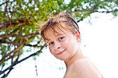 młody chłopak z mokrych włosów pochodzi z morza, uśmiechając się i wygląda