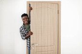 Zdjęcie "Afryki Guy Gesturing dobrze stojąc w otwartych drzwiach w domu" może być wykorzystywane do celów osobistych i komercyjnych zgodnie z warunkami zakupionej licencji Royalty-free. Obraz jest dostępny do pobrania w jakości wysokiej rozdzielczości do 5760x3840.