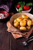 Świeże gotowane, nowe ziemniaki, z koperkiem, na drewnianym stole, wybiórcza ostrość. zbliżenie, tonowanie, brak osób,