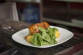 talerz z rybą filet mięsny z tłuczonymi ziemniakami, sałatka z sosem ziołowym