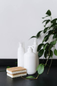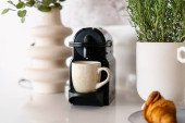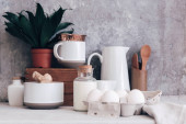 Herbata ziołowa w kubkach i pojemnikach na drewnianym stole przy czajniku. Koncepcja picia herbaty. Zrelaksuj się przy herbacie ceylonowej. Wygoda. Nowoczesne przybory kuchenne