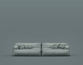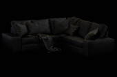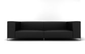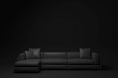 Czarna, trzyosobowa sofa na czarnym tle. Widok z przodu nowoczesnych, luksusowych, komfortowych, błyszczących skórzanych mebli tkaninowych z podłokietnikiem. Salon lub wystrój biura. Sztandar. 3d renderowanie