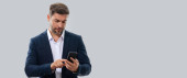 Koncepcja biznesowa - portret przystojny biznes człowiek gry cyfrowe tablet z uśmiechniętą twarz przekonany. Białe miejsca Background.Copy.