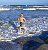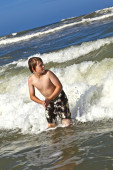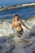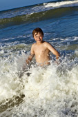młody chłopak cieszy się fale Morza