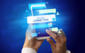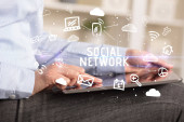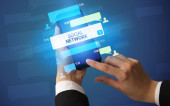 Pisanie kobiecej ręki na smartfonie z napisem SOCIAL NETWORK, koncepcja sieci społecznościowych
