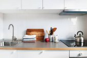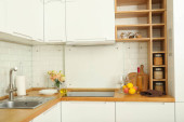 Zdjęcie "Jasna kuchnia z białymi ścianami w mieszkaniu" może być wykorzystywane do celów osobistych i komercyjnych zgodnie z warunkami zakupionej licencji Royalty-free. Obraz jest dostępny do pobrania w jakości wysokiej rozdzielczości do 5760x3840.