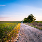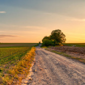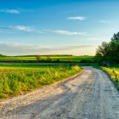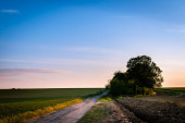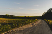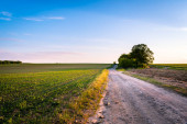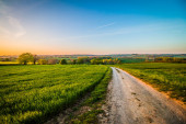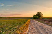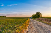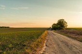 Dirp drogi i pola na wsi wiosną, zachód słońca krajobraz