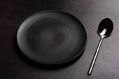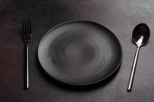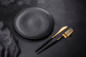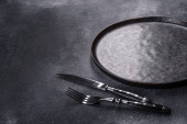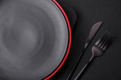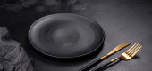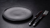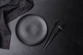 Puste czarne talerze, widelec i nóż na czarnym tle. Widok z góry, przestrzeń kopiowania