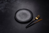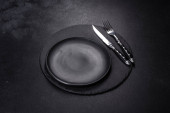 Zdjęcie "Puste czarne talerze, widelec i nóż na czarnym tle. Widok z góry, przestrzeń kopiowania" może być wykorzystywane do celów osobistych i komercyjnych zgodnie z warunkami zakupionej licencji Royalty-free. Obraz jest dostępny do pobrania w jakości wysokiej rozdzielczości do 5760x3840.