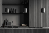 Zdjęcie "Mała kuchnia z ładnym wystrojem, drewniane meble czarne szczegóły i dekoracje" może być wykorzystywane do celów osobistych i komercyjnych zgodnie z warunkami zakupionej licencji Royalty-free. Obraz jest dostępny do pobrania w jakości wysokiej rozdzielczości do 5760x3840.