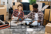 Rodzina trzyma wiertarkę elektryczną podczas pozowania w nowym mieszkaniu