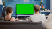 Para relaksująca się na sofie oglądająca zawartość wideo w mediach społecznościowych za pomocą tabletu cyfrowego z zielonym ekranem
