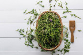 Arugula świeże zielone liście w misce przy białym stole.