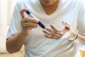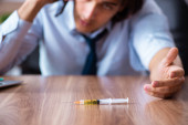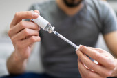 Człowiek wstrzykujący epinefrynę przy użyciu autoiniektora Strzykawka jako leczenie nagłe reakcji alergicznej