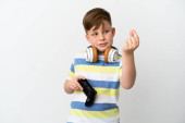Mały rudy chłopiec trzyma podkładkę do gry na białym tle z kciukami w górze, bo stało się coś dobrego.
