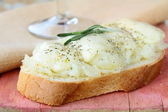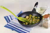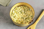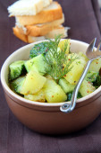 sałatka ziemniaczana z ogórkiem i koperkiem na brązowym tle