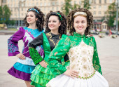 Dwie kobiety w irlandzki taniec sukienki i perukę, taniec