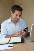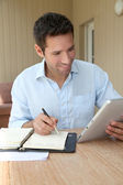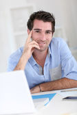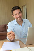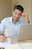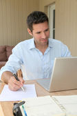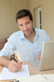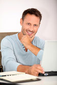 uśmiechnięty mężczyzna pracujący w domu na komputerze przenośnym