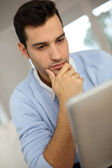 uśmiechnięty mężczyzna pracujący w domu na komputerze przenośnym