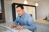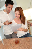 człowiek za pomocą elektronicznego tabletki w domu kuchnia