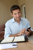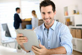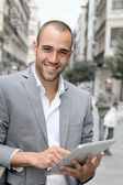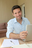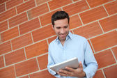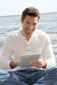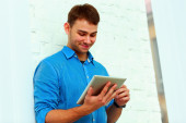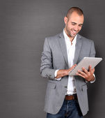 atrakcyjny mężczyzna z touchpad na niebieskim tle