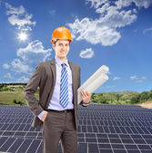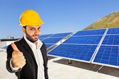 biznesmen stojąc na instalację kolektorów słonecznych