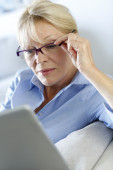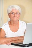 starszy kobieta siedzi w kanapie z laptopem