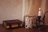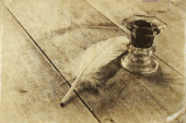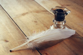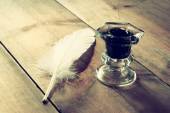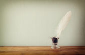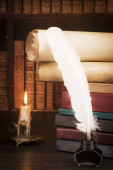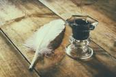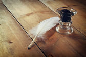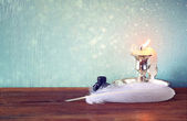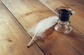Niski klucz obrazu białe piórko, Kałamarz i świecę na drewnianym stołem