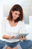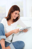 piękna kobieta siedzi na kanapie z elektroniczną kartę