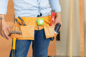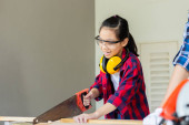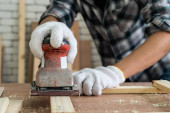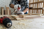 Stolarz pracujący w warsztacie drzewnym, człowiek wykonujący prace stolarskie w warsztacie