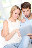 młoda kobieta siedzi na kanapie z elektronicznych tabletki