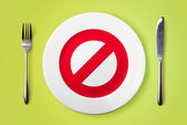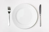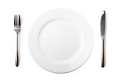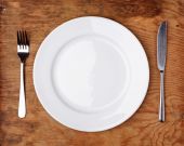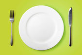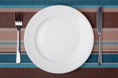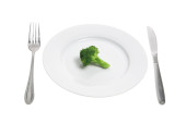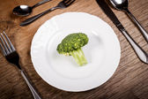Nóż, widelec i płyta z brokułów na drewnianym stole.