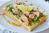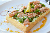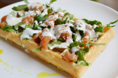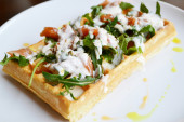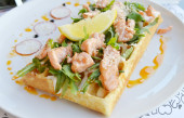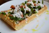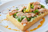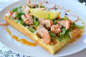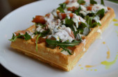 Belgijski wafel z rukolą, sosem śmietanowym i łososia