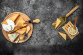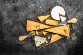 Zdjęcie "Parmezan. Różne rodzaje sera z nożem na ciemnym tle. Sery ustawione dor blu chedar camamber brie. miejsce na tekst, widok z góry." może być wykorzystywane do celów osobistych i komercyjnych zgodnie z warunkami zakupionej licencji Royalty-free. Obraz jest dostępny do pobrania w jakości wysokiej rozdzielczości do 5760x3840.