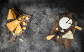 Parmezan. Różne rodzaje sera z nożem na ciemnym tle. Sery ustawione dor blu chedar camamber brie. miejsce na tekst, widok z góry.