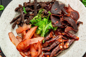 Mięso i warzywa na patelni. Podawanie potraw w restauracji