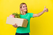 Młoda urugwajska dziewczyna robi ruch podnosząc pudełko pełne rzeczy odizolowanych na żółtym tle licząc pięć palcami