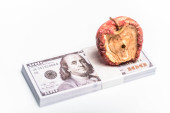 Bitcoin ze złotymi sztabkami i monetami na banknotach wyizolowanych na białym tle.