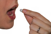 zbliżenie obrazu kobiety z otwartymi ustami przyjmującej witaminę w białym tle.