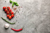 Zdjęcie "Gotowanie składników tła. Przyprawy, czarny pieprz, czosnek, cebula, zielenina, pomidory. oliwa z oliwek na białym kamieniu beton blat widok góry miejsca skopiować. Przygotowanie zdrowej żywności." może być wykorzystywane do celów osobistych i komercyjnych zgodnie z warunkami zakupionej licencji Royalty-free. Obraz jest dostępny do pobrania w jakości wysokiej rozdzielczości do 5760x3840.