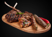 Kuchnia turecka zmieszana kebab. Shish kebab, shaverma, grillowany kurczak. Dania kuchni orientalnej, leżące na chlebie pita i ozdobione zielenią i warzywami, sosami i frytkami.