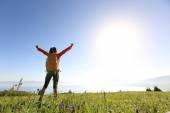 kobieta otwarte ramiona pod wschodem słońca na morzu