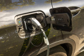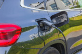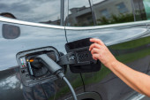 Zbliżenie widoku podłączonego kabla ładowania do czarnego samochodu ze stacji ładowania pojazdów elektrycznych. Szwecja.