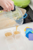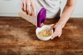 przycięty widok kobiety wylewanie płatków kukurydzianych do miski w pobliżu butelki mleka